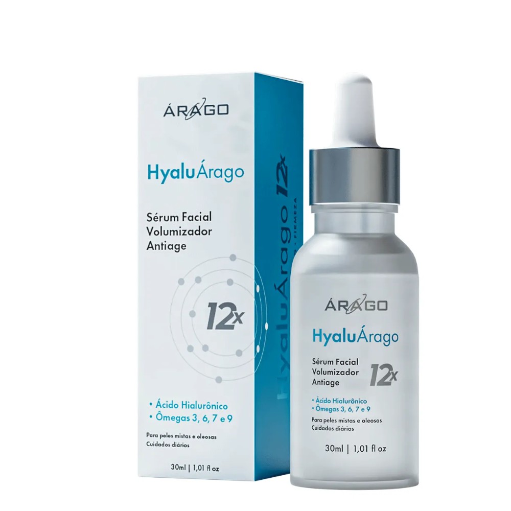 Hyalu Arago Sérum Facial Volumizador 30ml É um sérum preenchedor de rosto com 1,5% de ácido hialurônico. Com a “tecnologia 12x” o Sérum Facial foi desenvolvido com 8 moléculas de ácido hialurônico combinados com 4 tipos de ômegas, que em sinergia promovem uma trama de sustentação pró-colágeno na pele e pescoço. Preserva o volume e aumenta a densidade cutânea.