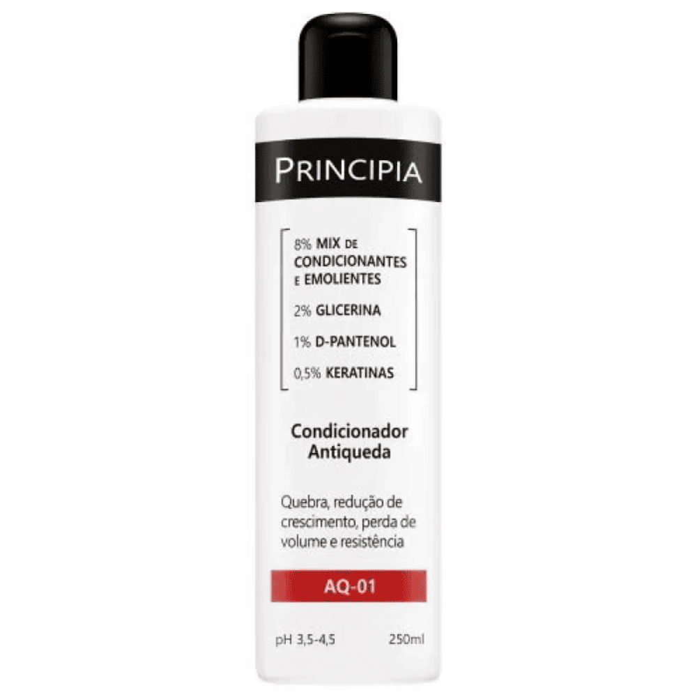 Principia Condicionador Antiqueda 2% Glicerina + 1% D-Pantenol + 0,5% Keratinas Principia Skincare AQ-01 250ml,é formulado para ajudar a fortalecer os cabelos, reduzir a queda e proporcionar um couro cabeludo saudável.