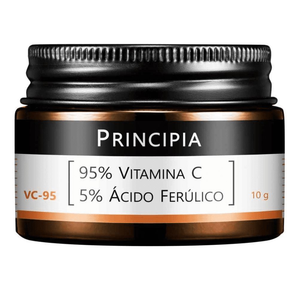 Principia Skincare Pó Ultrafino Vitamina C Pura 95% + 5% Ácido Ferúlico VC-95 Possui alta eficácia contra linhas, rugas, olheiras e hiperpigmentação.