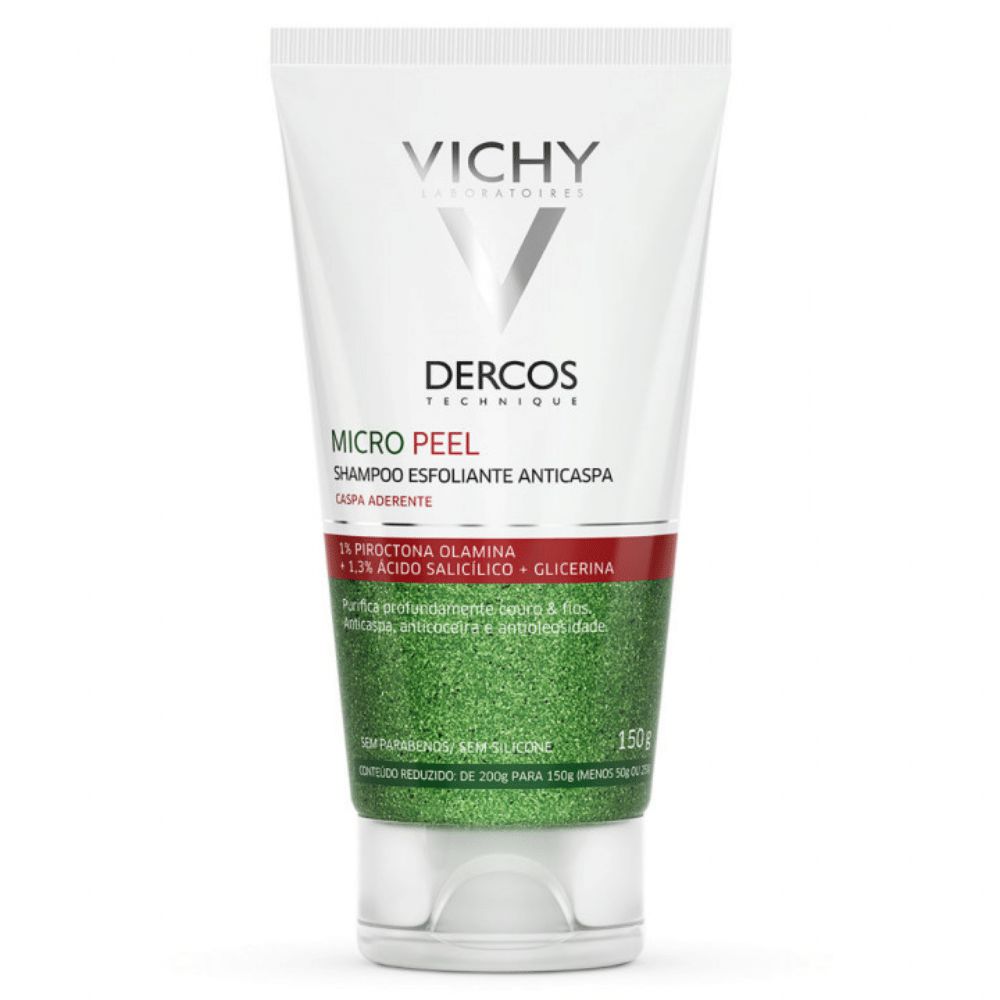 Vichy Dercos Micropeel Shampoo Esfoliante 150ml Shampoo detox com dupla ação microesfoliante e textura gel, elimina visivelmente a caspa desde a primeira utilização, acalma e limpa profundamente o couro cabeludo. Pode ser usado como shampoo de ataque, em uso conjunto com outro shampoo anticaspa ou como shampoo de limpeza profunda.